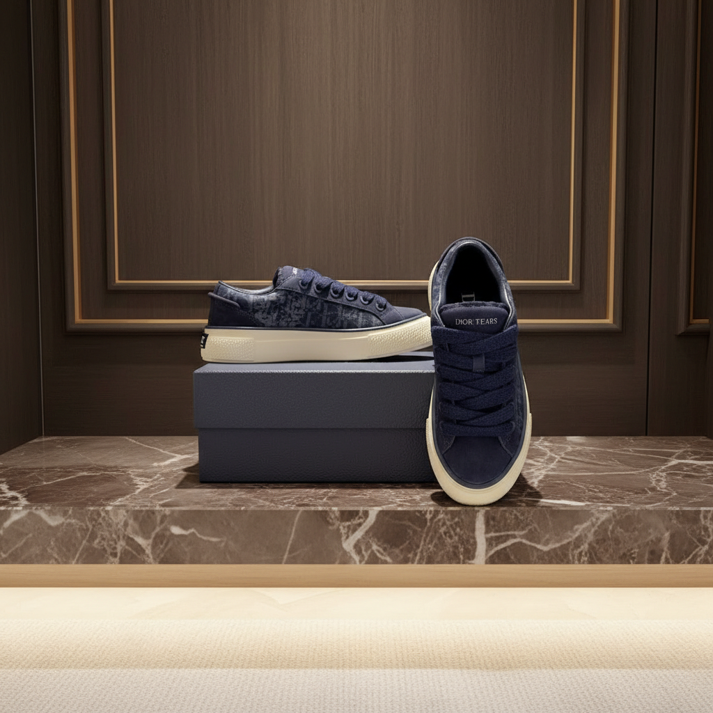 Dior Tears navy sneakers with signature monogram design, premium canvas, and rubber sole, blending luxury style and comfort for casual and streetwear fashion lovers.