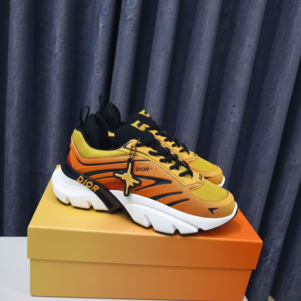 Dior Men’s Yellow Orange Chunky Sneakers, stylish breathable mesh, bold design with comfortable thick sole, perfect for casual streetwear and sports fashion.