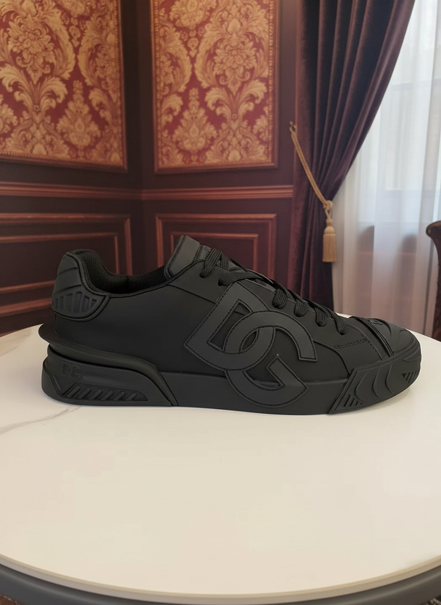 Dolce & Gabbana men’s black leather sneakers with bold DG logo, featuring a stylish modern design and comfortable fit for casual and streetwear fashion.