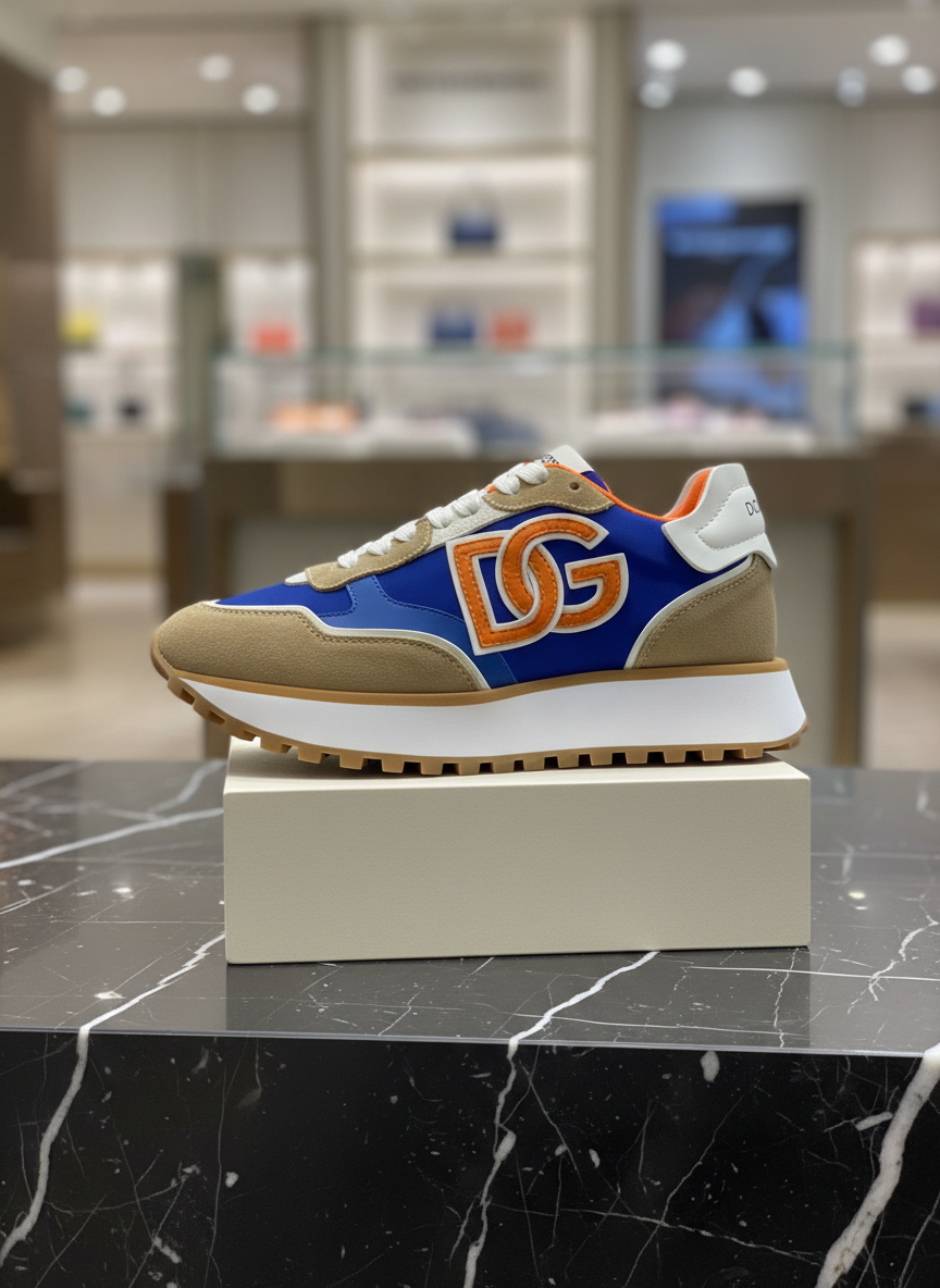 Dolce & Gabbana men’s sneakers in blue and beige suede with bold orange DG logo, lightweight sole, and modern sporty design for casual and streetwear style.