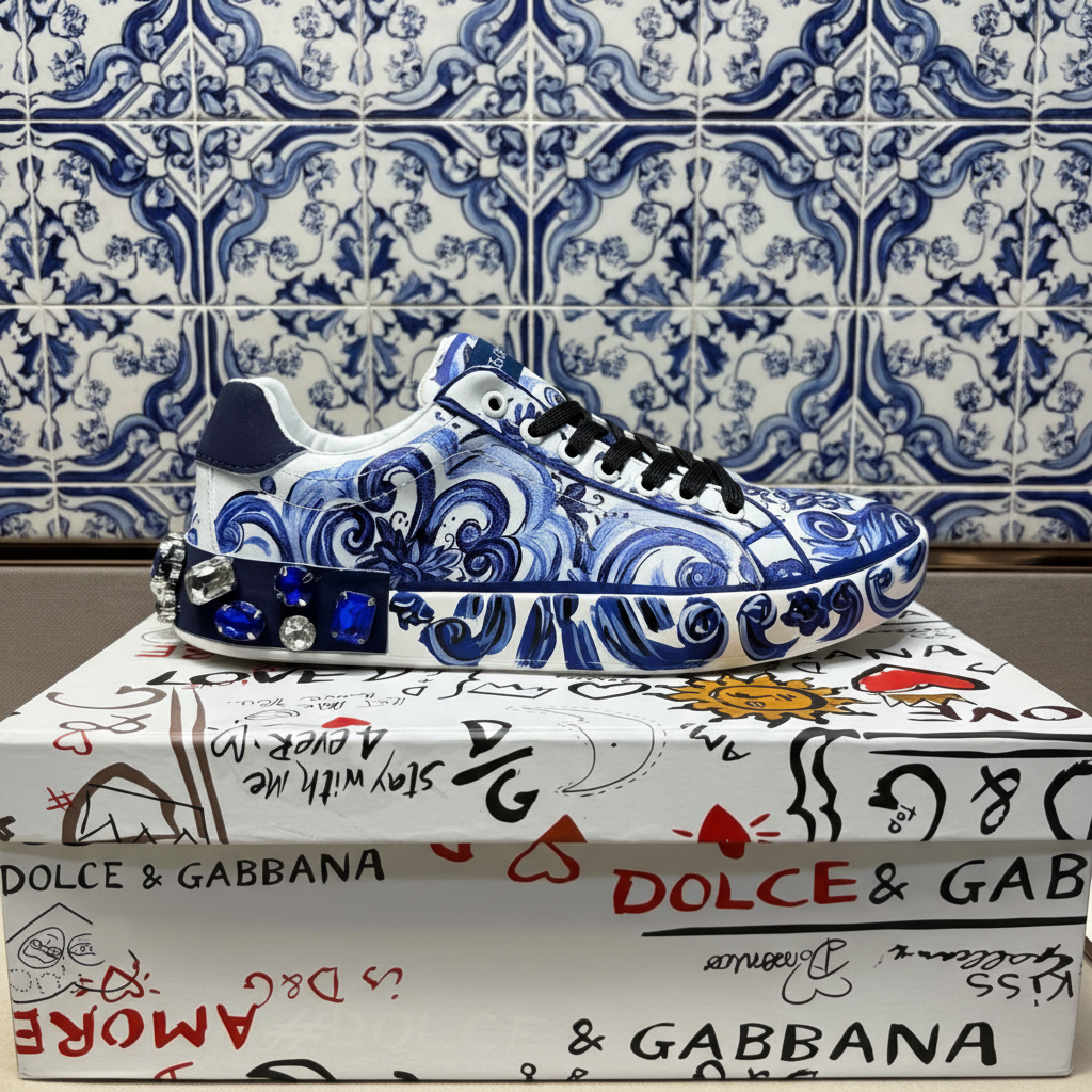 Dolce & Gabbana men’s sneakers with artistic blue and white floral print, jeweled accents, premium leather, and stylish design for luxury casual wear.
