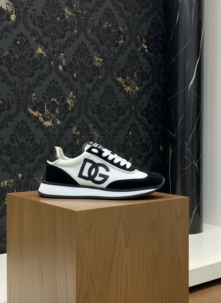 Dolce & Gabbana black and white sneakers with bold DG logo, breathable mesh, suede accents, and cushioned sole for stylish comfort and everyday wear.