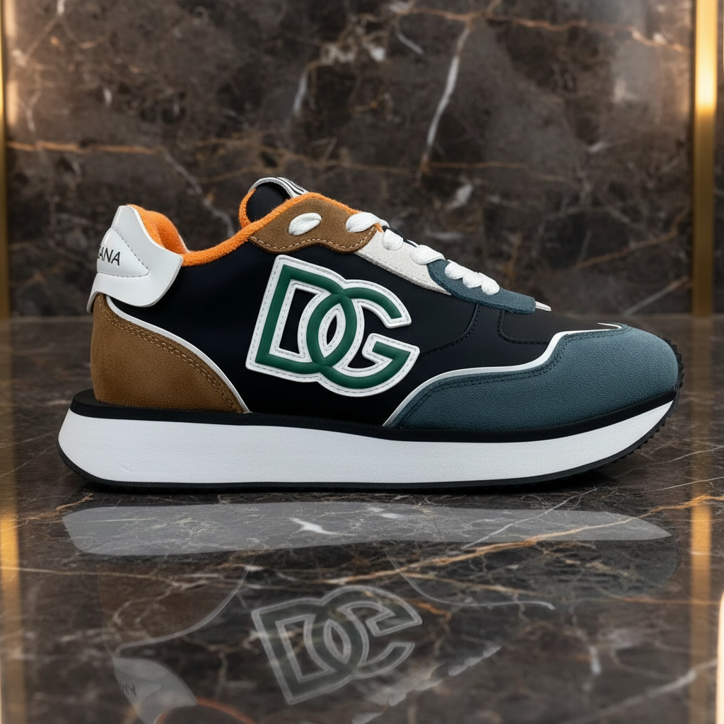 Dolce & Gabbana men’s sneakers, stylish black, teal, and brown design with bold DG logo, premium materials, and comfortable sole for casual and sport wear.