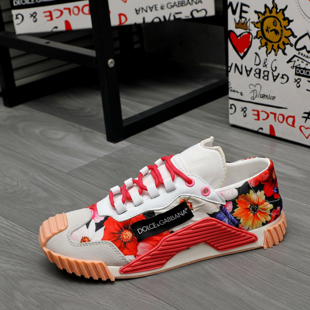 Dolce & Gabbana floral print sneakers with vibrant red laces, cushioned sole, and premium materials for stylish comfort and everyday wear.