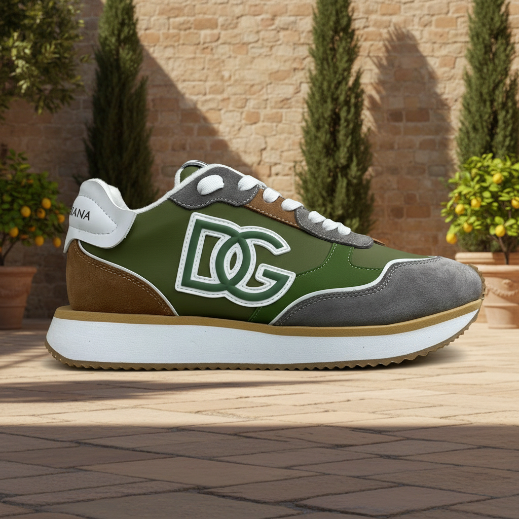 Dolce & Gabbana men’s green suede and leather sneakers with DG logo, stylish retro design, comfortable sole, perfect for casual and streetwear fashion.