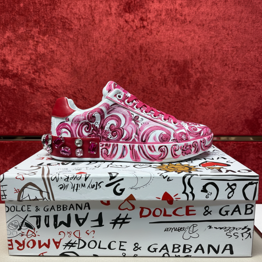 Dolce & Gabbana women’s sneakers with pink artistic swirl print, red accents, jeweled strap detail, and white sole for a bold luxury fashion statement.