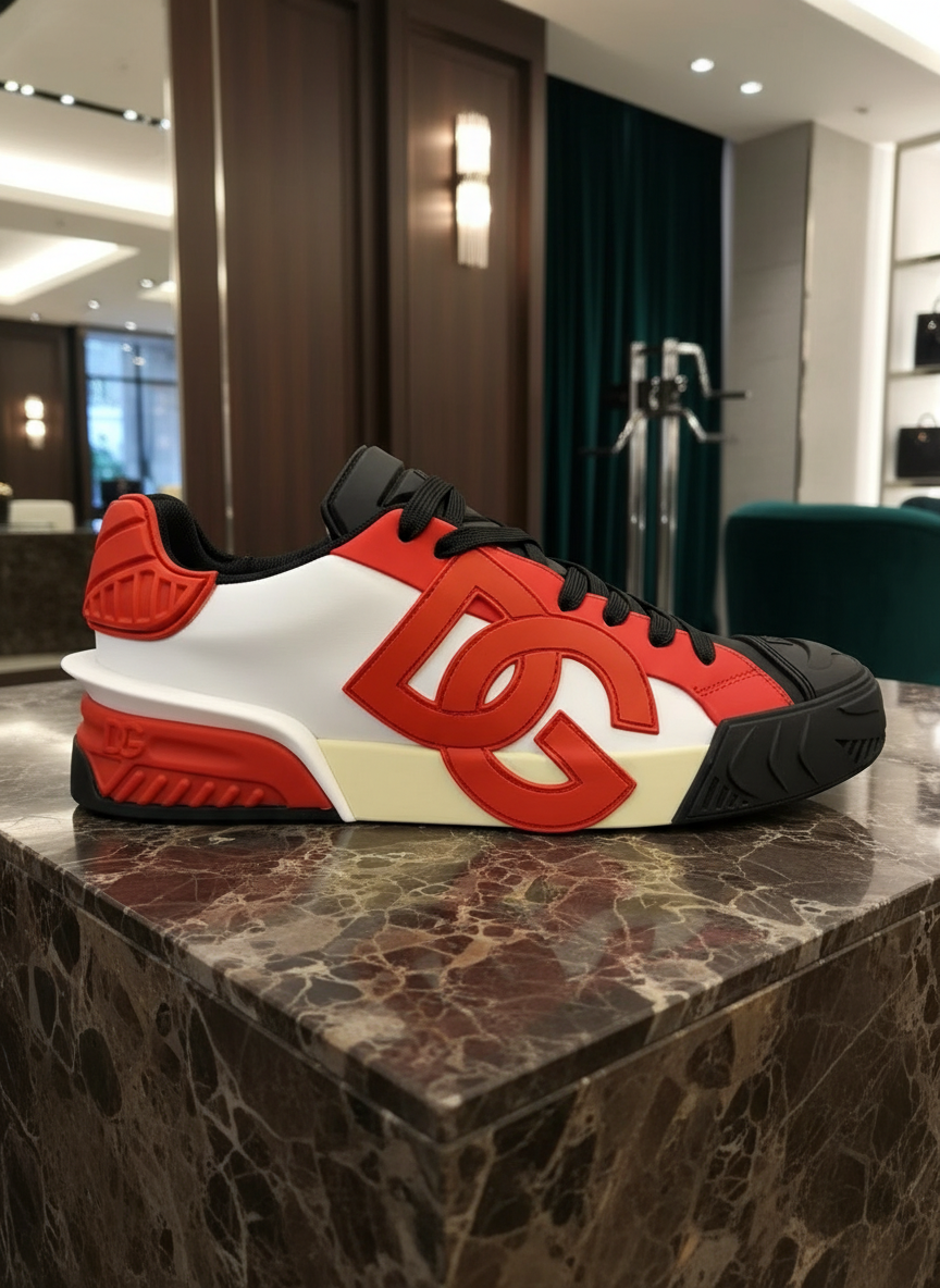 Dolce & Gabbana men’s sneakers in red, white, and black with bold DG logo, premium leather, and modern chunky sole for streetwear style and comfort.