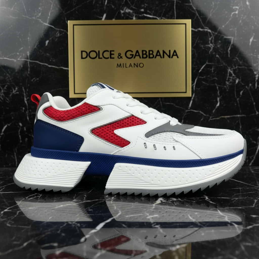 Dolce & Gabbana Men’s White Red Blue Chunky Sneakers, Stylish Leather and Mesh Design, Comfortable Sport Shoes for Casual and Athletic Wear