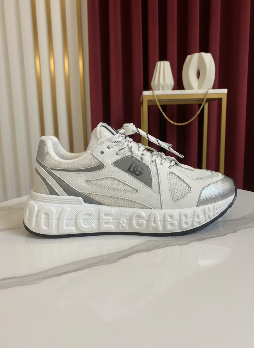 Dolce & Gabbana white luxury sneakers with silver accents, breathable mesh panels, and bold logo sole, perfect for stylish comfort and everyday wear.