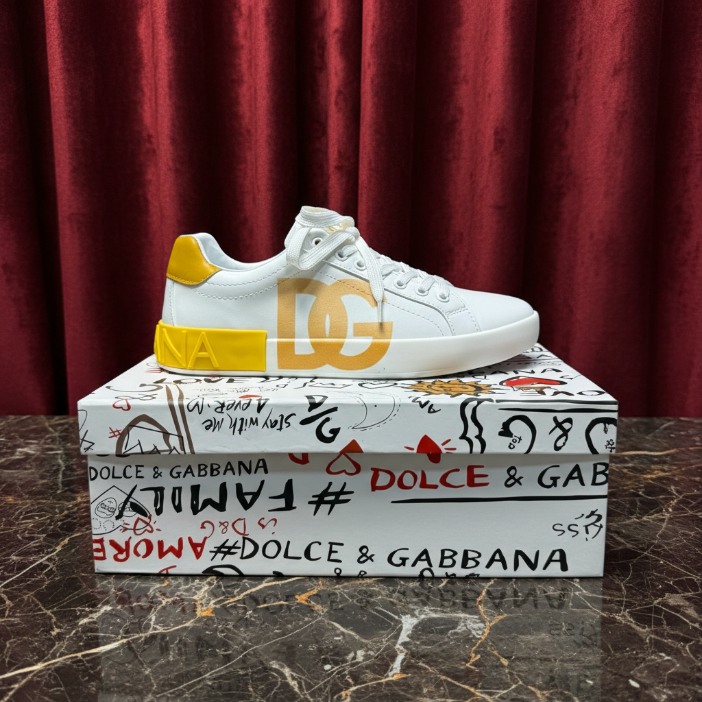 Dolce & Gabbana white leather sneakers with bold yellow accents and oversized DG logo, combining luxury style with casual comfort for trendsetters.