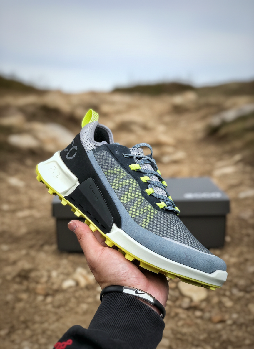 ECCO Men’s Outdoor Sneakers, lightweight breathable mesh, durable grip sole, stylish grey with neon accents, perfect for running, hiking, and casual wear.