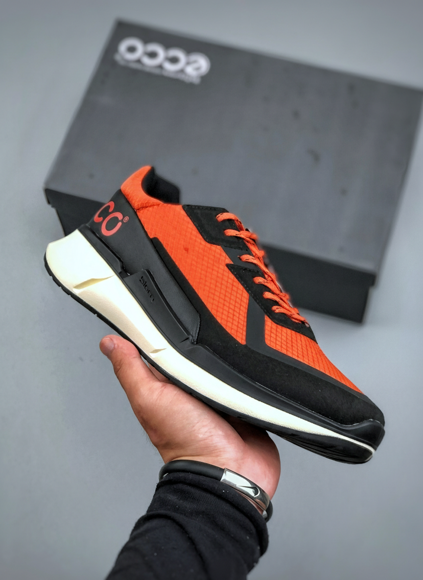 ECCO Men’s Sport Sneakers, lightweight breathable mesh, vibrant orange design, shock-absorbing sole, perfect for running, walking, and casual wear.
