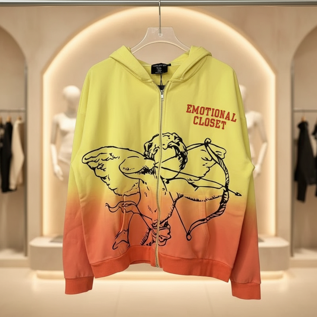Emotional Closet gradient yellow-orange hoodie with cupid print, full zip front, and streetwear style for casual fashion lovers.