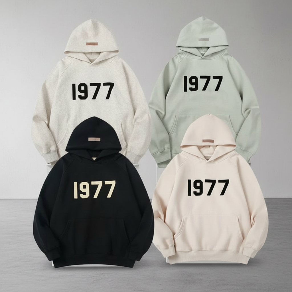 Essentials 1977 Hoodie, classic oversized style, soft cotton blend, casual streetwear, perfect for autumn and winter, available in multiple colors for men and women.