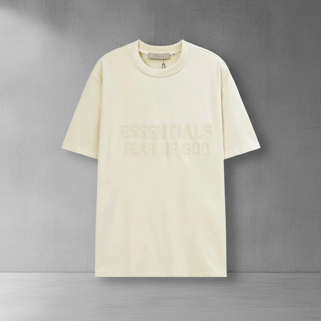 Essentials Cream Tee: Flocked Logo, Premium Cotton, Unisex Streetwear