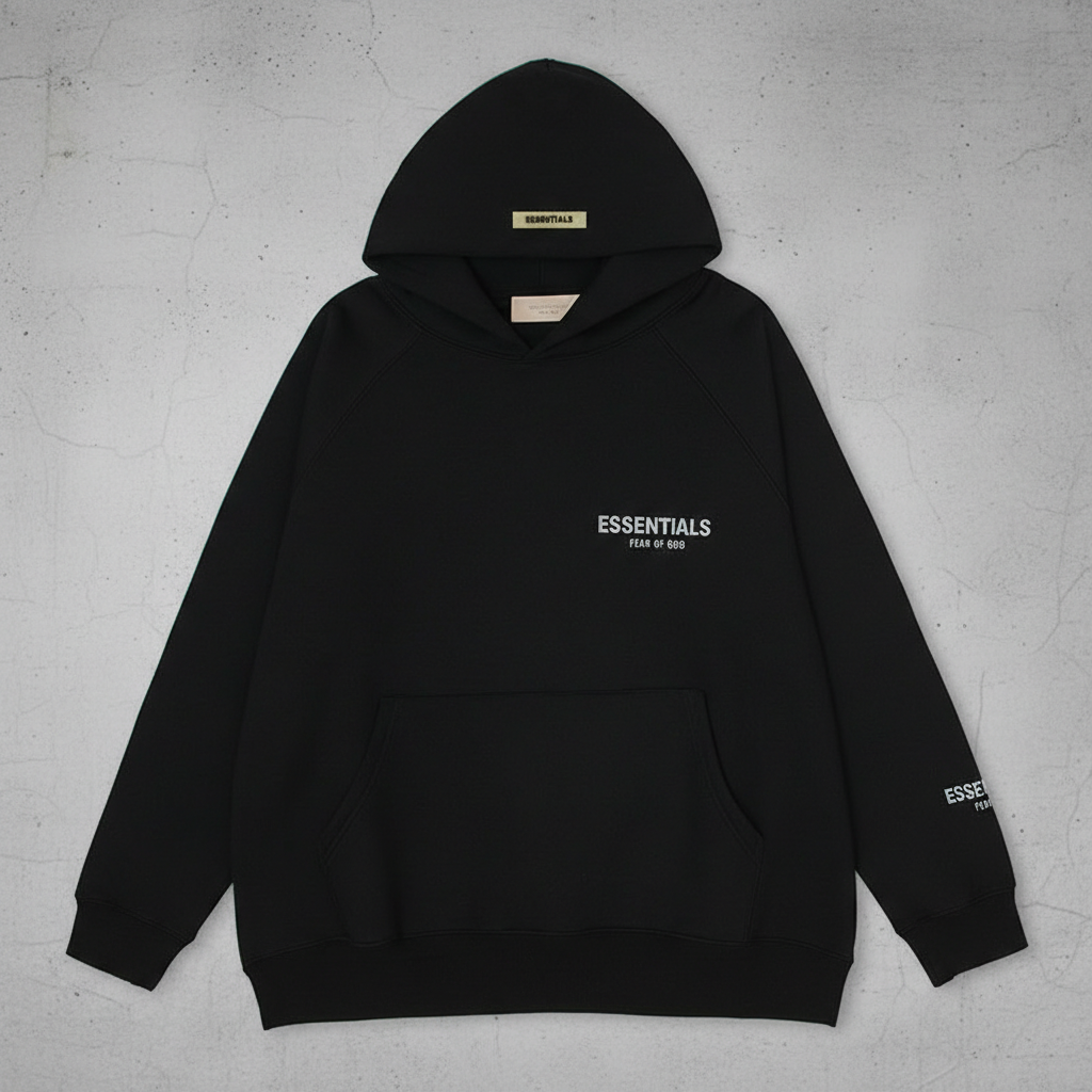 Essentials Fear of God Black Hoodie, premium cotton, stylish streetwear design with kangaroo pocket, perfect for casual wear and layering in all seasons.