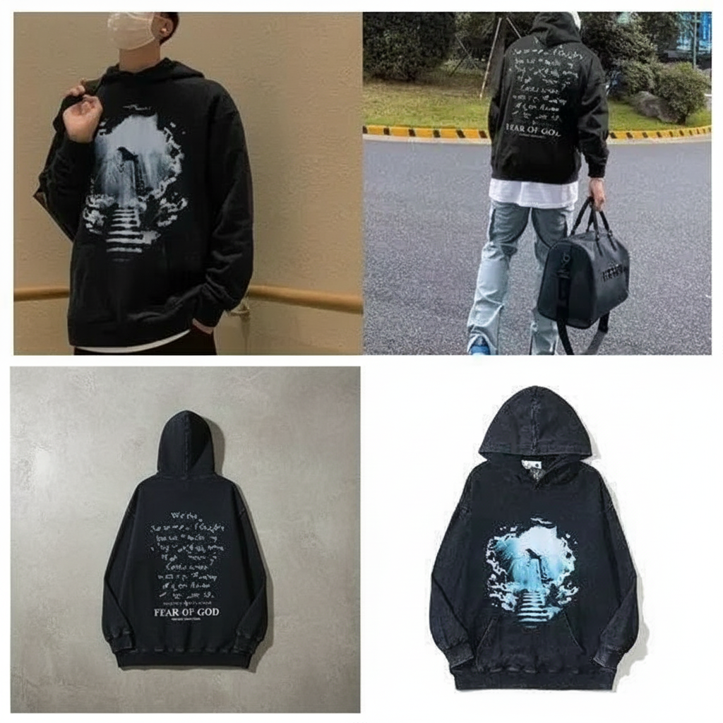 Fear of God Essentials black graphic hoodie, trendy streetwear with artistic print, soft cotton blend, casual oversized fit for men and women, perfect for autumn and winter fashion.