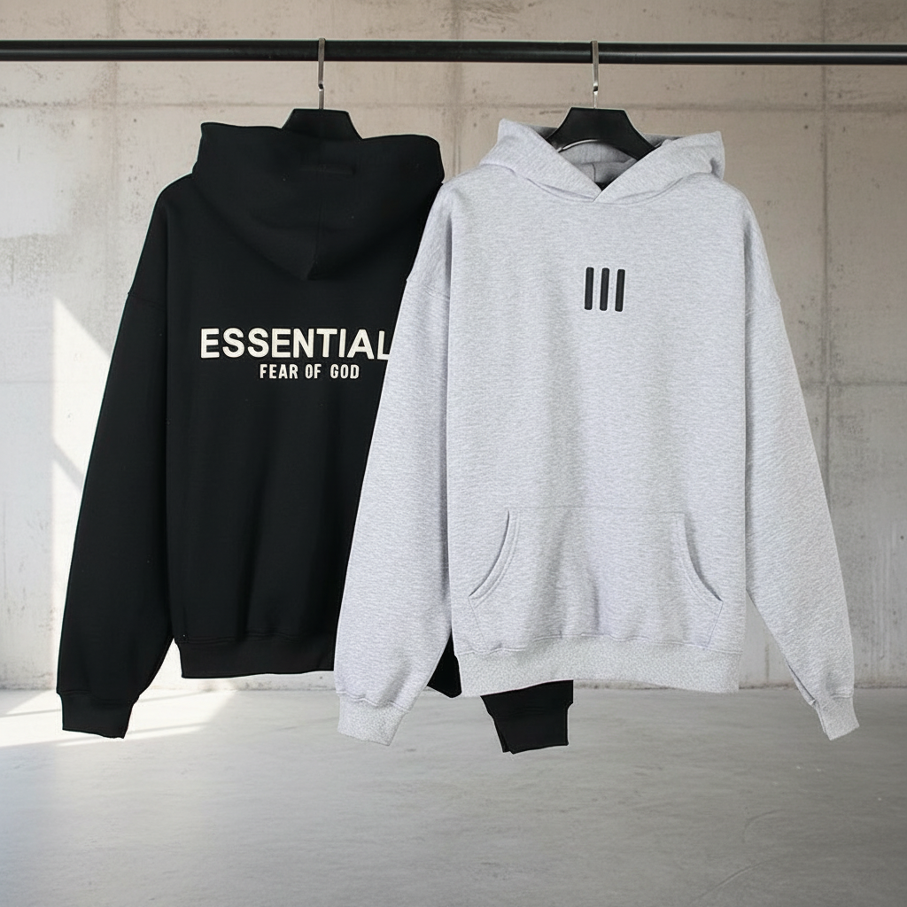 Fear of God Essentials hoodies, classic black and grey, soft cotton, casual style, perfect for streetwear, comfort fit, premium quality for everyday wear.