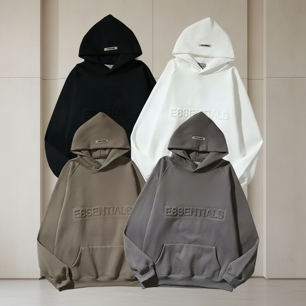 Essentials Hoodies, cozy fleece pullover with front logo, available in black, white, taupe, and gray, perfect for casual wear and street style.