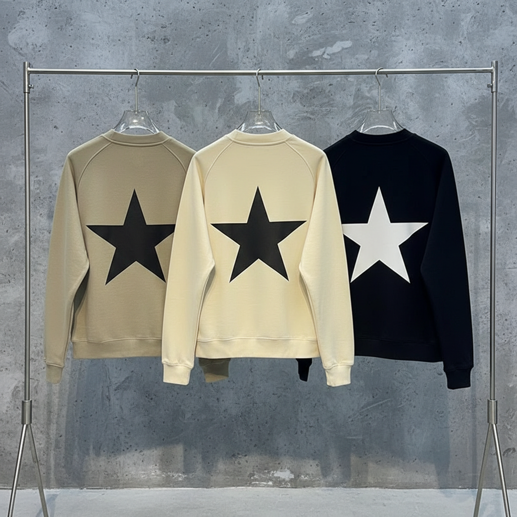 HoodiesEssentials Star Print Sweatshirt, casual oversized pullover, soft cotton, unisex fashion tops for autumn winter, streetwear style for men and women.