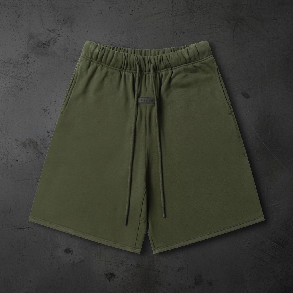 / Fear of God Essentials Olive Shorts: Unisex, Cotton Blend, Elastic Waist