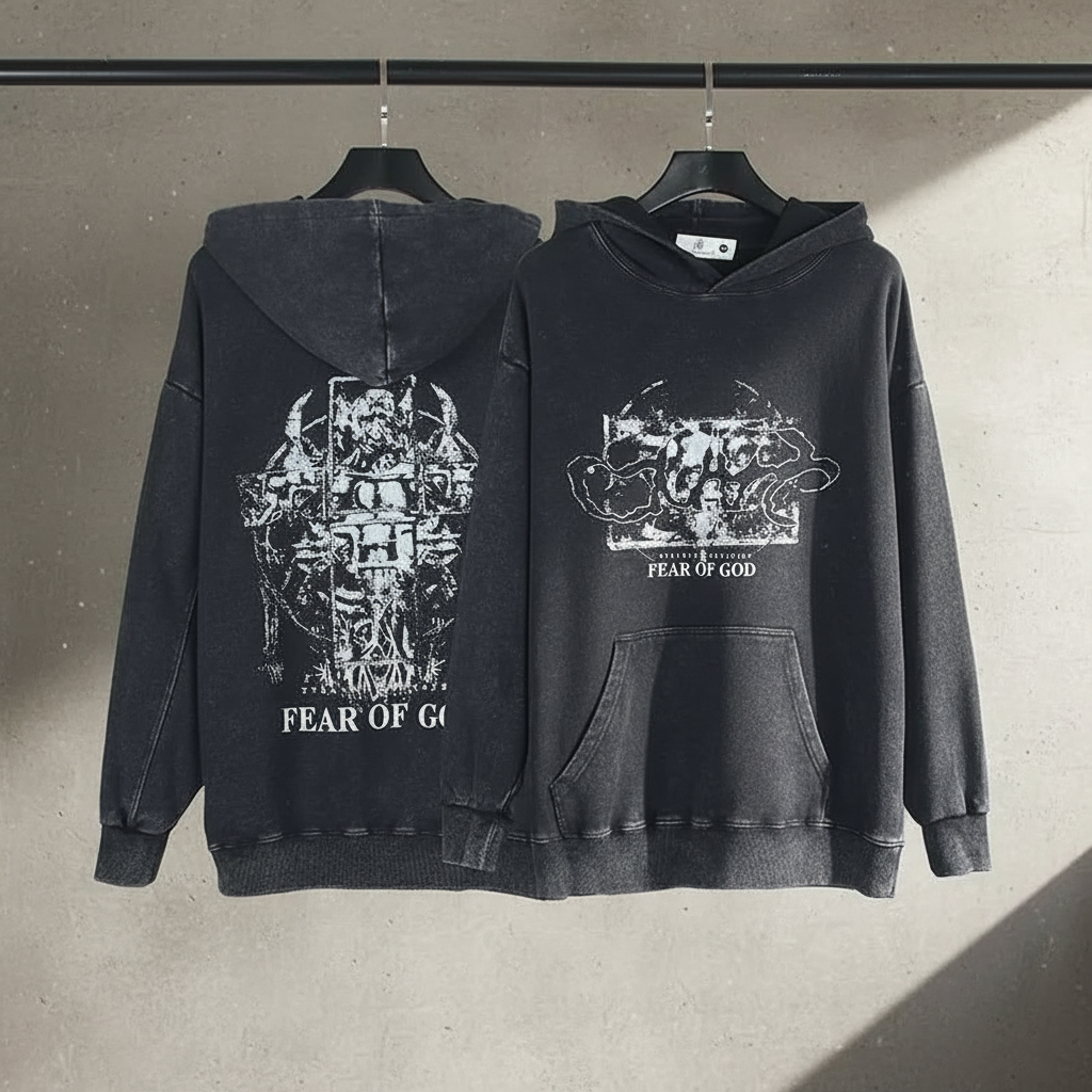 Fear of God Essentials black graphic hoodie, vintage wash, streetwear style, soft cotton, front pouch pocket, unisex casual fashion pullover.