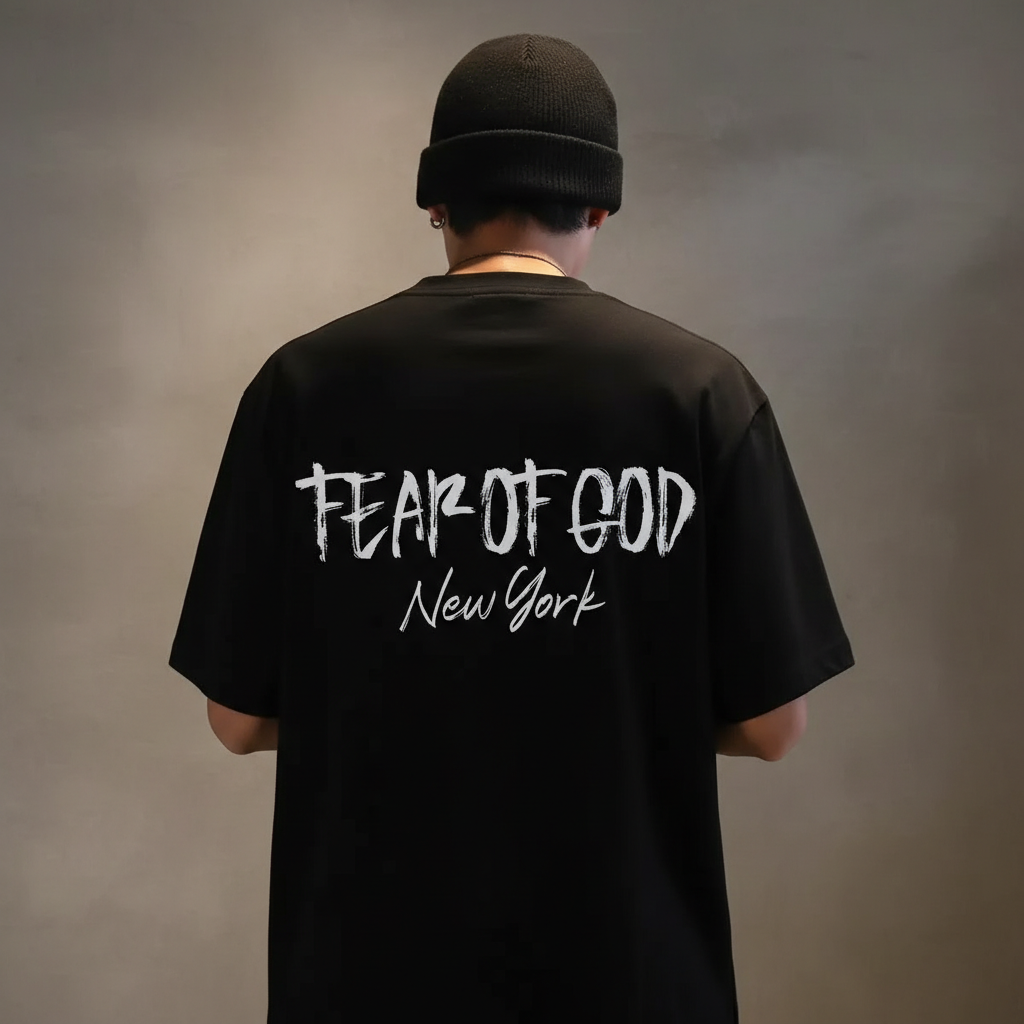 Fear of God New York casual black T-shirt, premium cotton, streetwear style, perfect for urban fashion lovers seeking comfort and trend in everyday outfits.