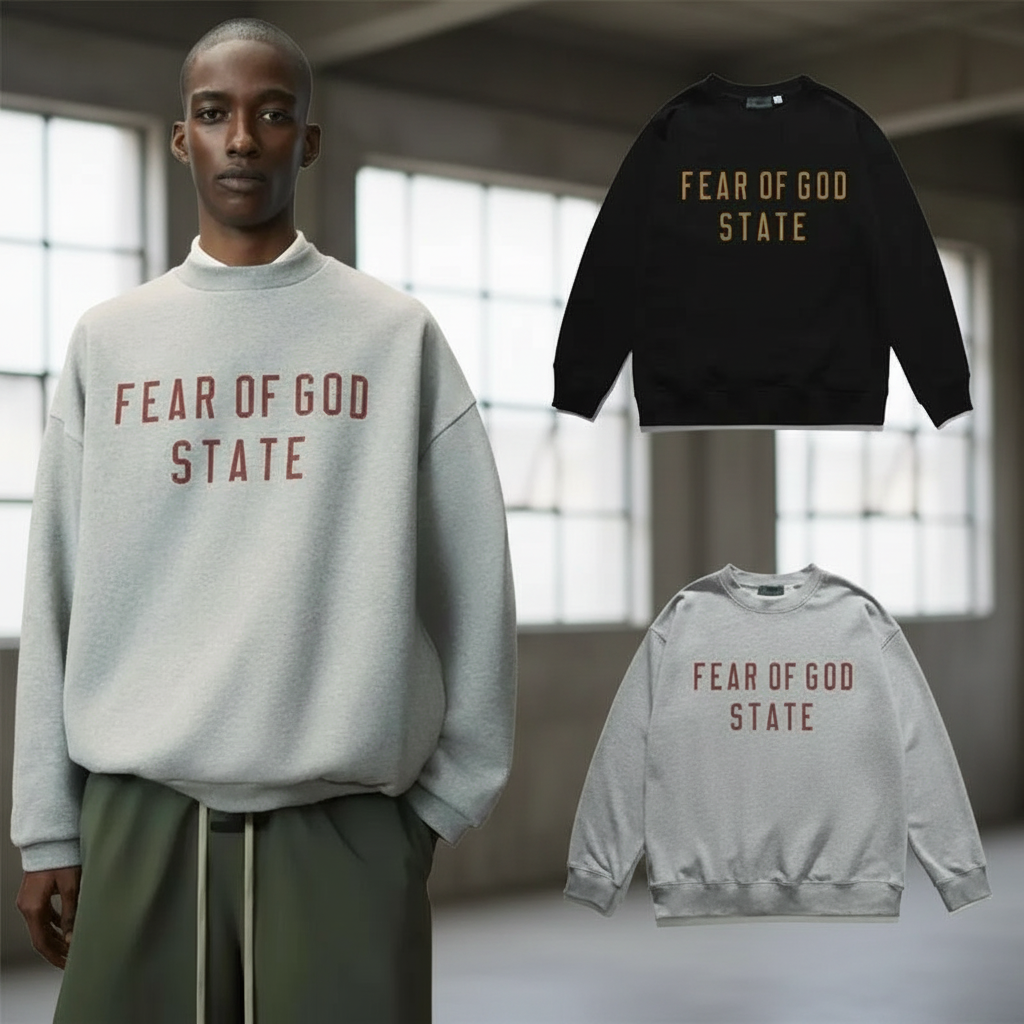 Fear of God Essentials State sweatshirt, casual unisex pullover, premium cotton, stylish streetwear, available in black and grey, perfect for everyday wear.