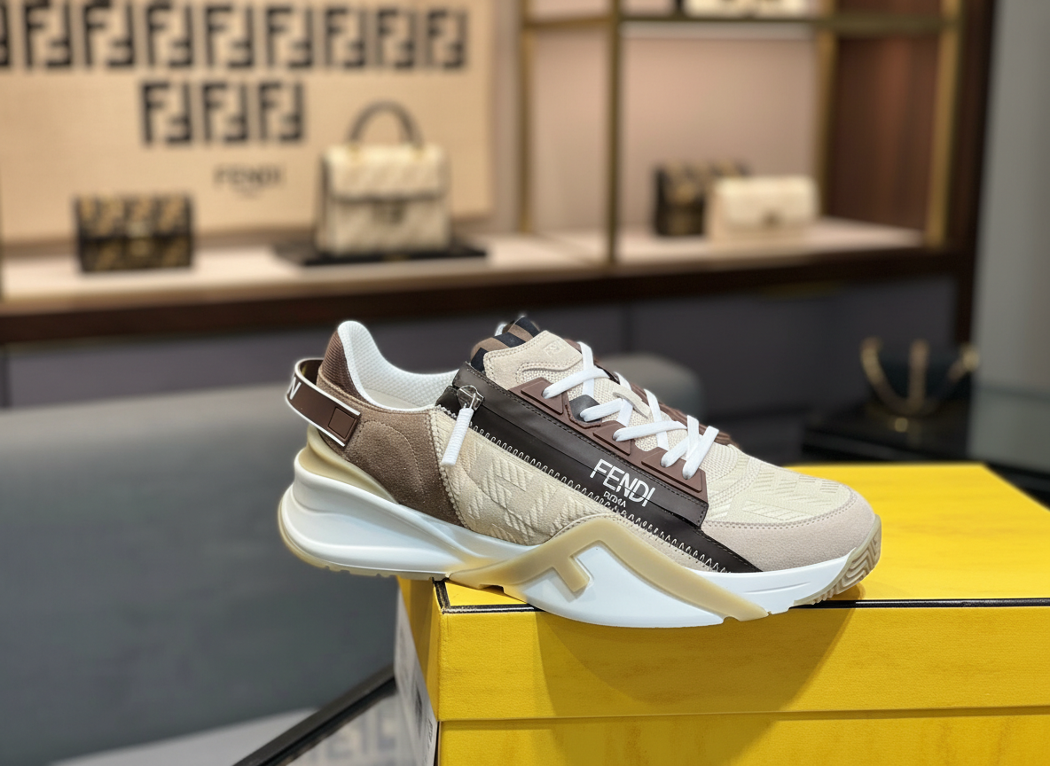 Fendi Roma beige and brown luxury sneakers with suede and mesh design, chunky sole, stylish zip detail, and signature logo for premium comfort and fashion.