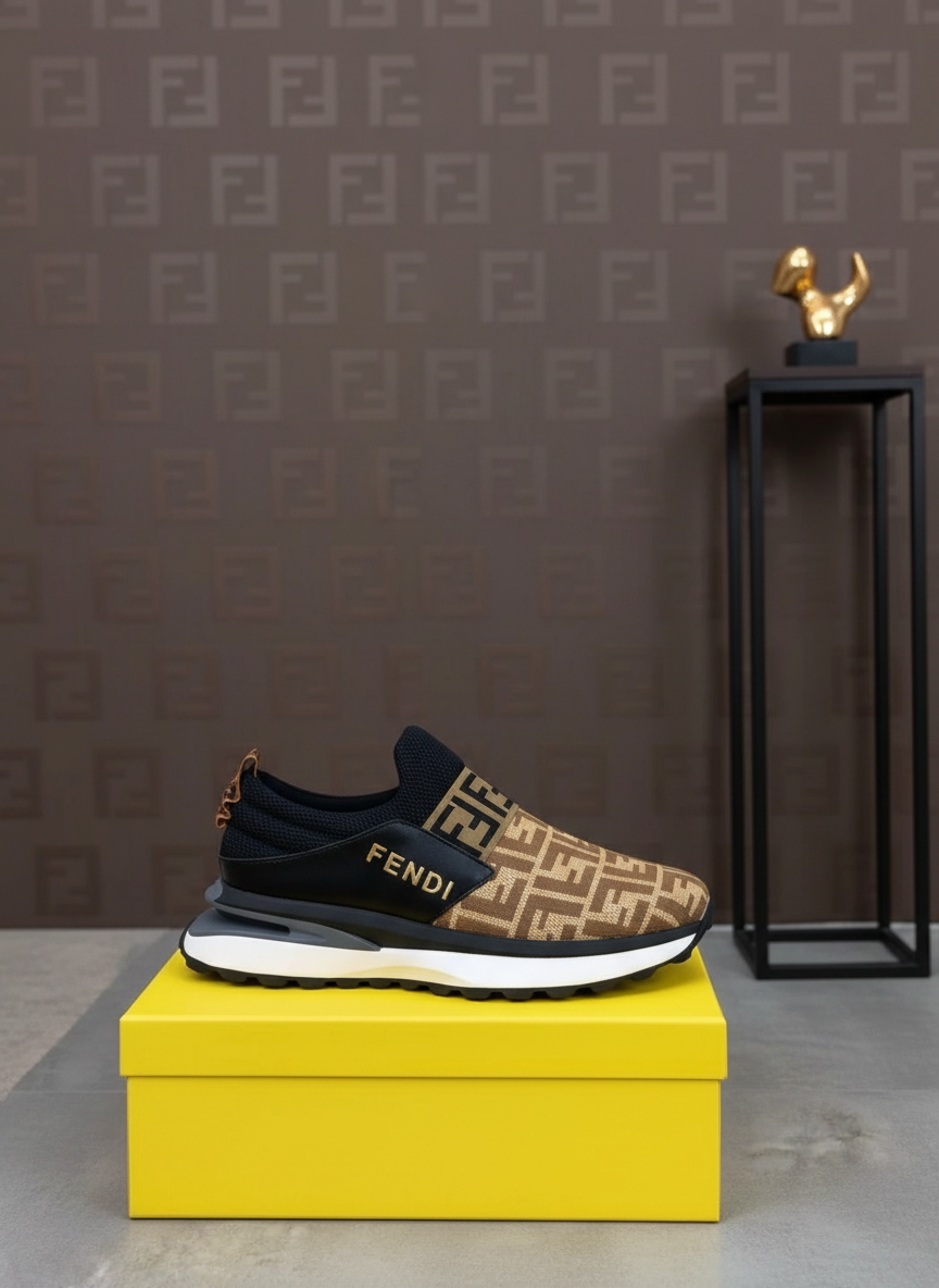 Fendi men’s logo slip-on sneakers, breathable mesh upper with iconic FF motif, cushioned sole for comfort, perfect for casual and sporty style.