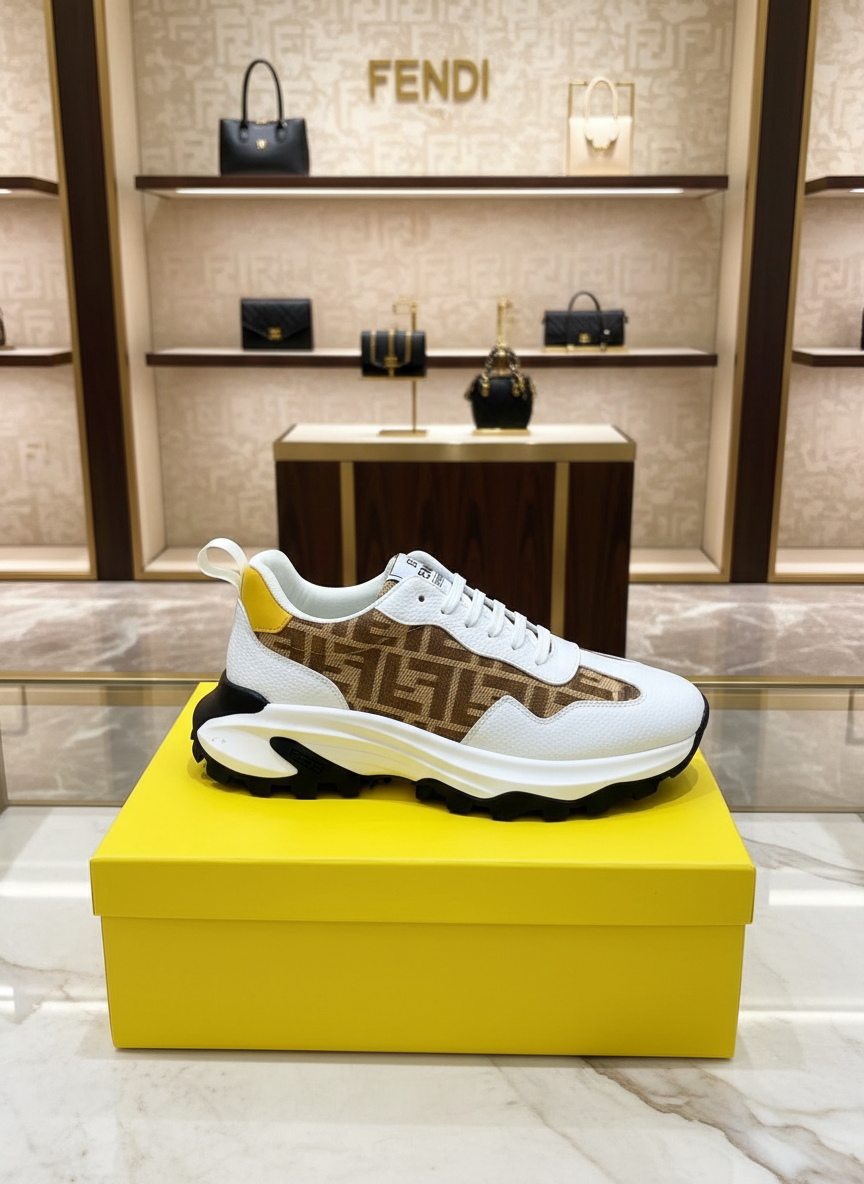Fendi men’s luxury sneakers in white and brown with iconic FF logo design, breathable mesh, and chunky sole for stylish comfort.