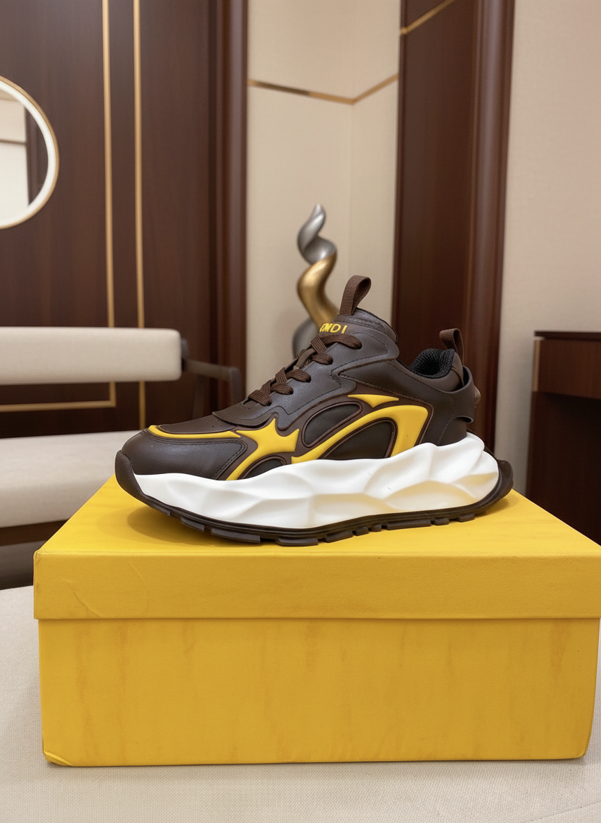 Fendi men’s brown and yellow chunky sneakers with bold design, premium leather, and sculpted white sole for style and comfort.