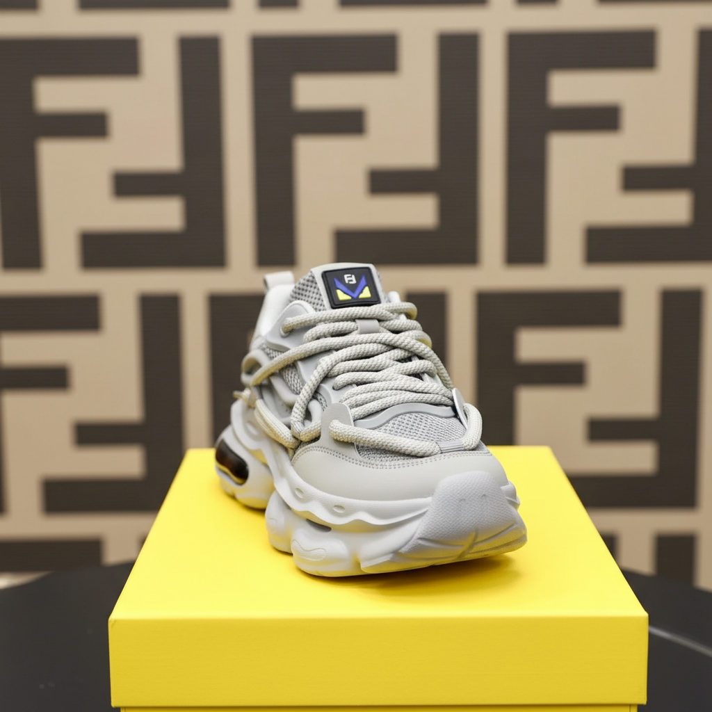Fendi Men’s Chunky Sneakers, stylish grey mesh and leather design with unique rope laces, cushioned sole, and air bubble heel for ultimate comfort and fashion-forward streetwear.