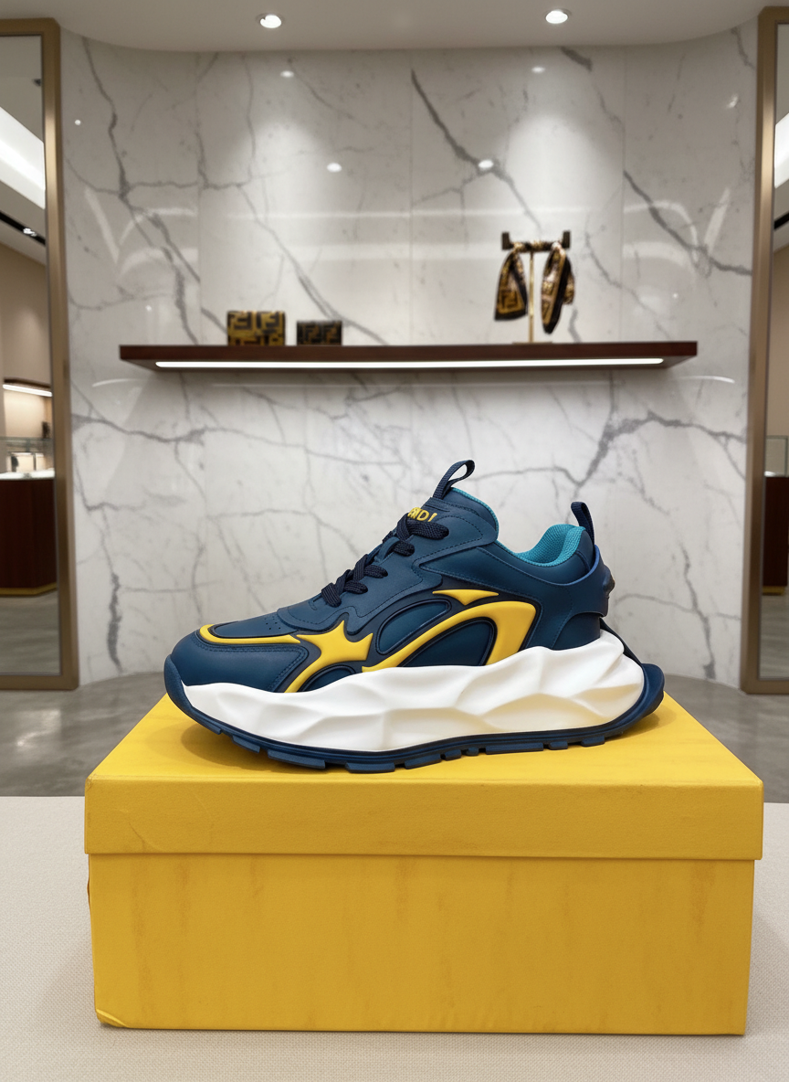 Fendi Men’s Luxury Chunky Sneakers, Blue and Yellow Designer Running Shoes with Stylish Wave Sole, Comfortable Fashion Sports Footwear for Casual or Athletic Wear