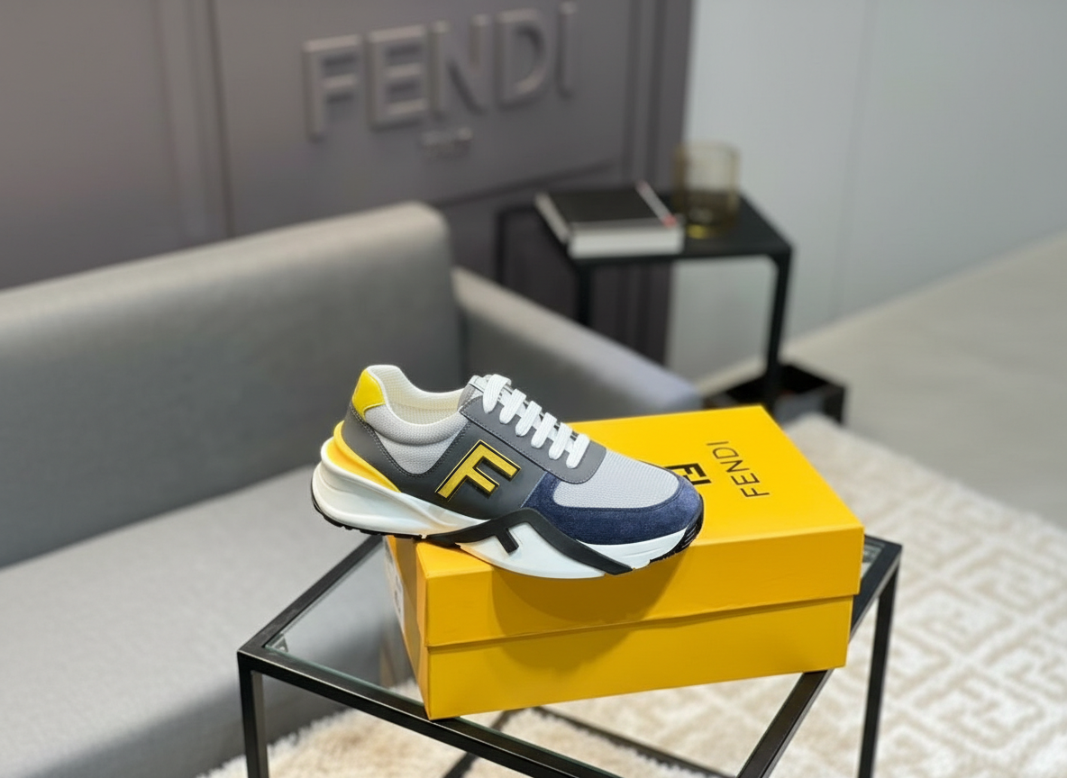 Fendi men’s sneakers in grey, yellow, and navy, featuring bold F logo, mesh and suede panels, cushioned sole, and stylish sporty design for comfort and fashion.