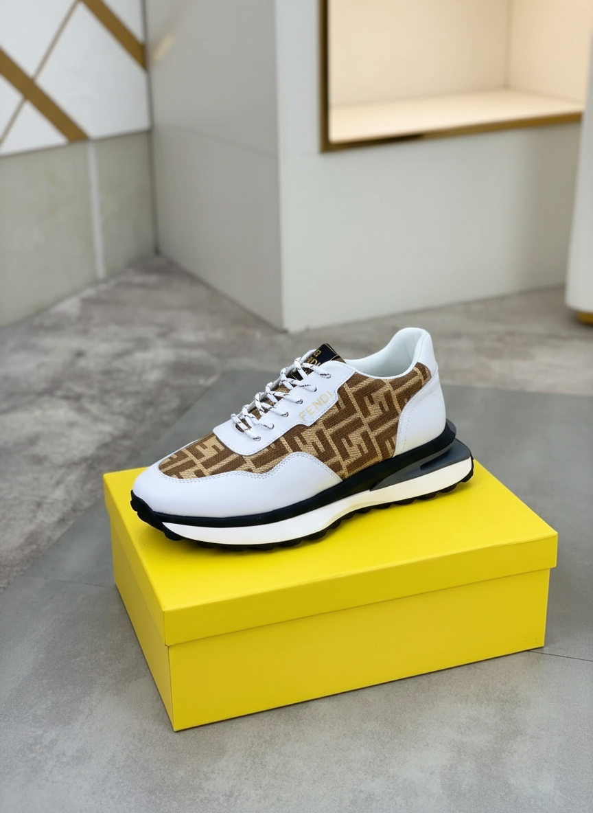 Fendi Sneakers featuring signature brown monogram canvas, white leather accents, and cushioned sole for premium comfort and style. Perfect for casual and luxury fashion.