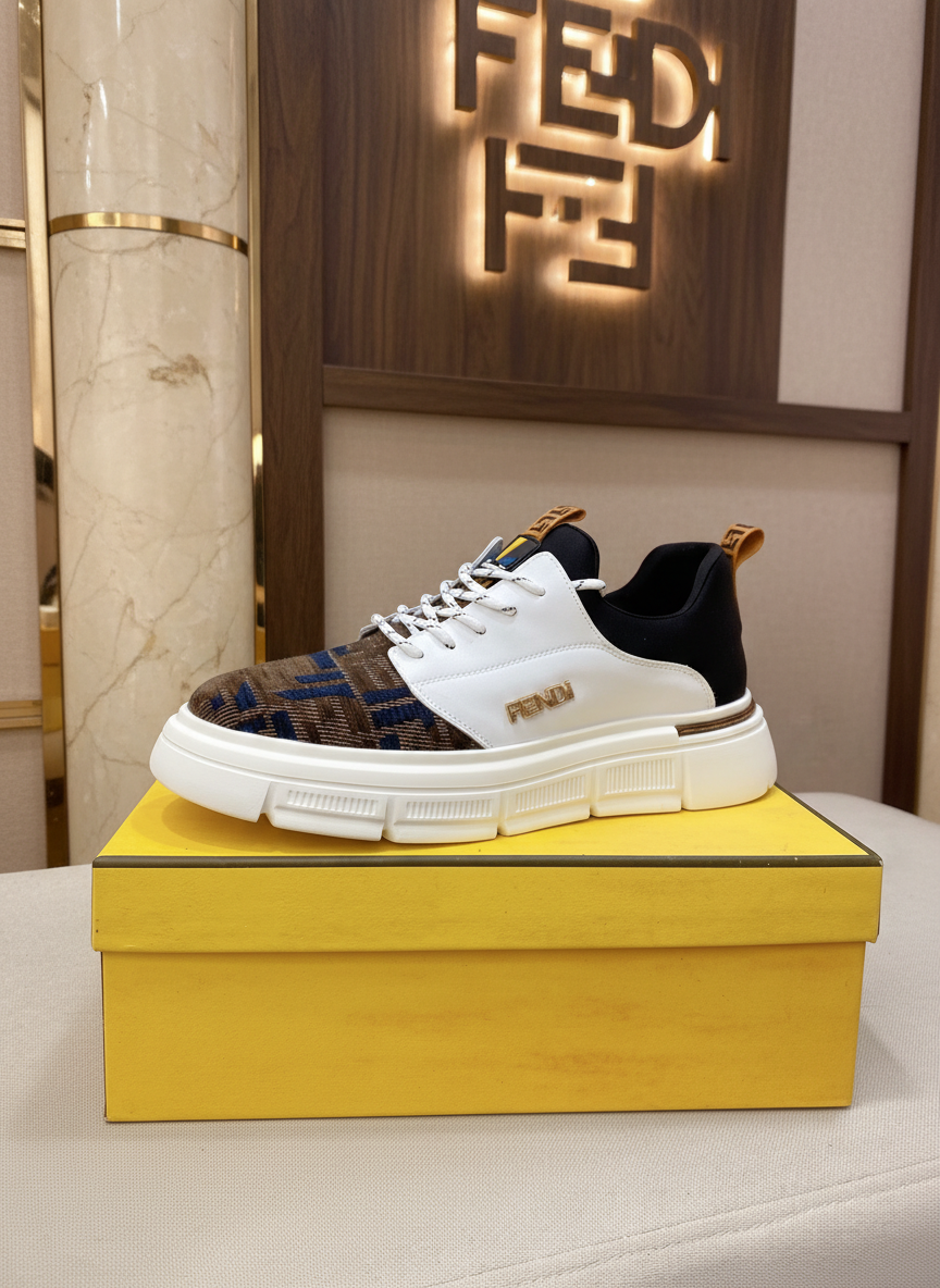 Fendi luxury sneakers with iconic FF pattern, white leather, and cushioned sole, offering comfort and style for fashionable everyday wear.