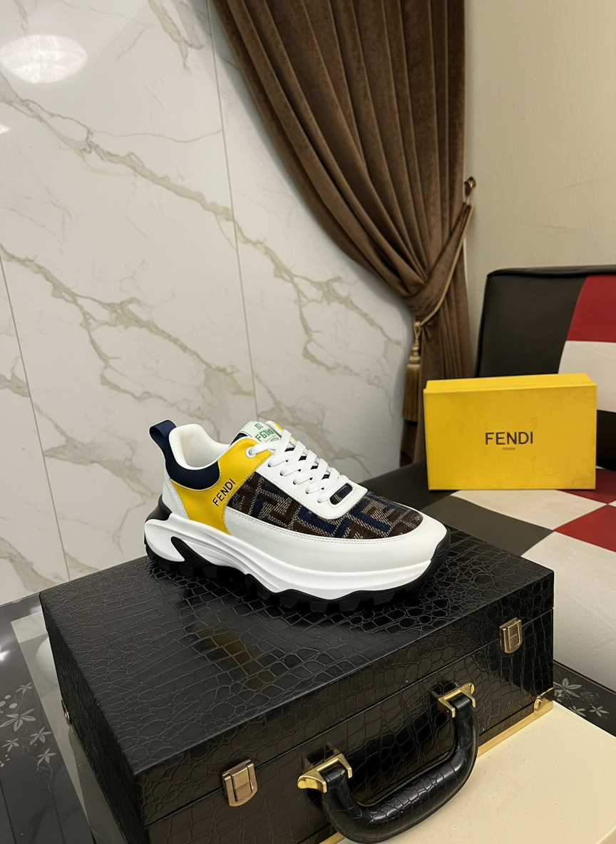 Fendi Men’s Luxury Sneakers, featuring signature logo pattern, yellow leather accents, breathable mesh, chunky sole, perfect for casual streetwear and high-fashion style.