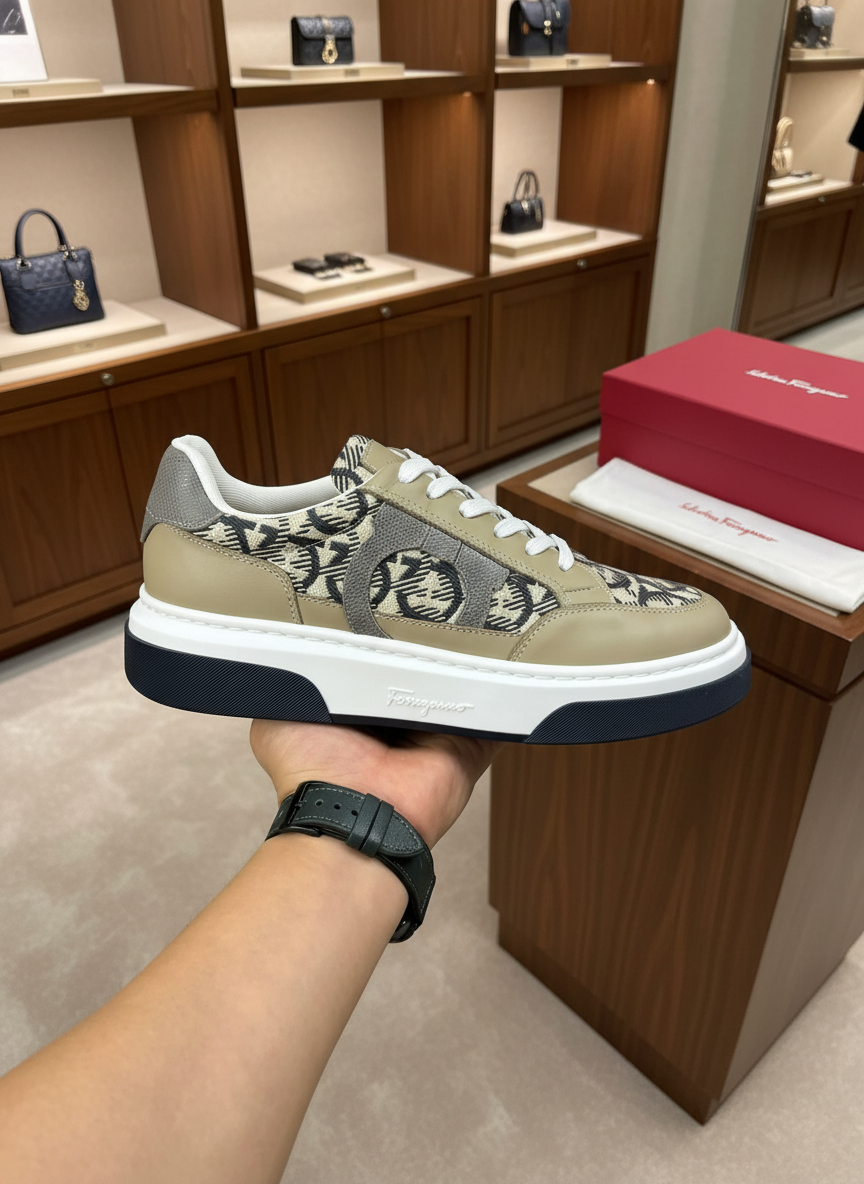 Ferragamo men’s beige leather and patterned fabric sneakers, stylish lace-up design, comfortable sole, perfect for casual and streetwear fashion.