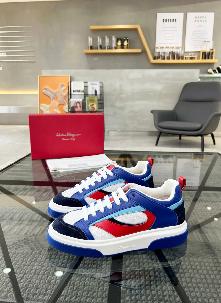 Salvatore Ferragamo men’s luxury sneakers in red, blue, and white, featuring premium leather, breathable mesh, and a stylish modern design perfect for casual or sporty looks.