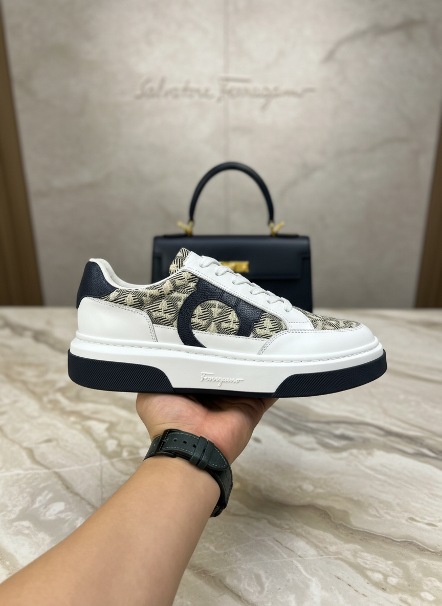 Ferragamo men’s sneakers with signature Gancini pattern, premium leather, and navy accents, offering luxury style and comfort for casual wear.
