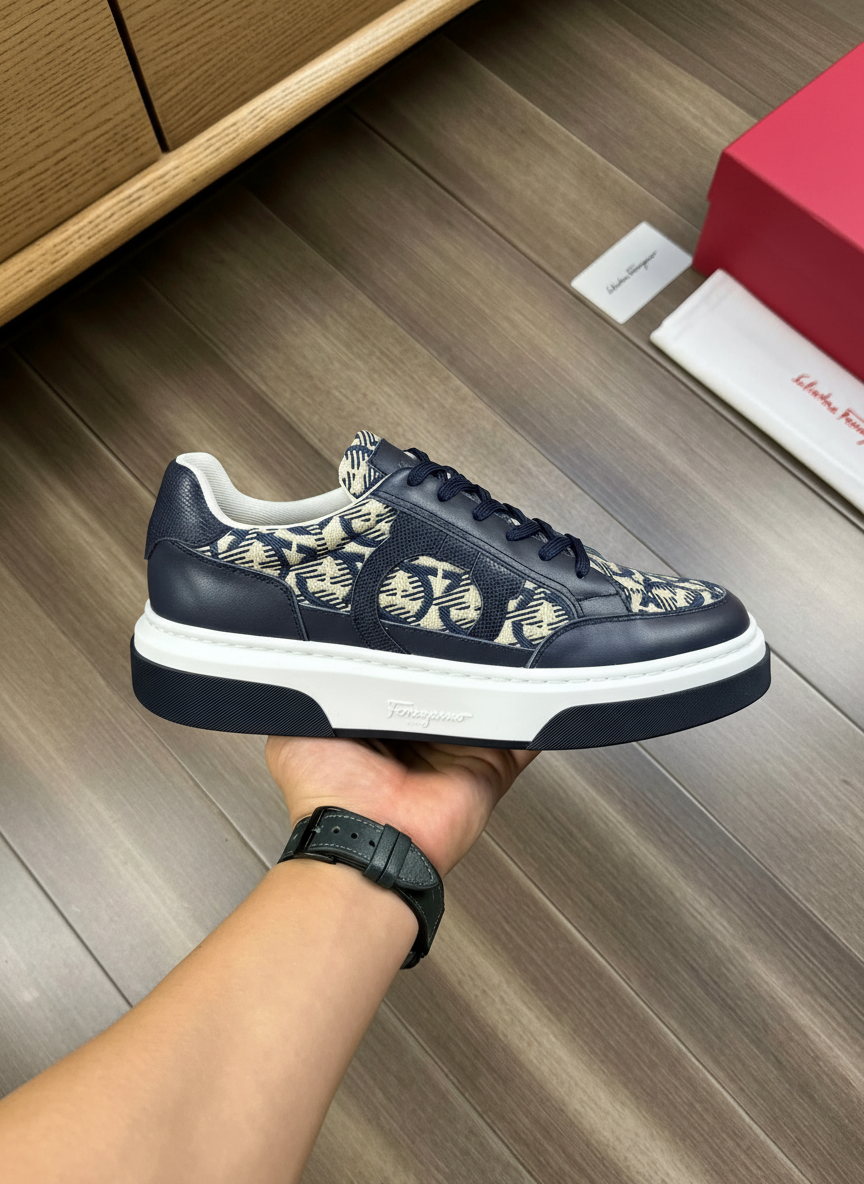 Salvatore Ferragamo men’s navy leather sneakers with signature patterned fabric, cushioned sole, and premium craftsmanship for stylish comfort.