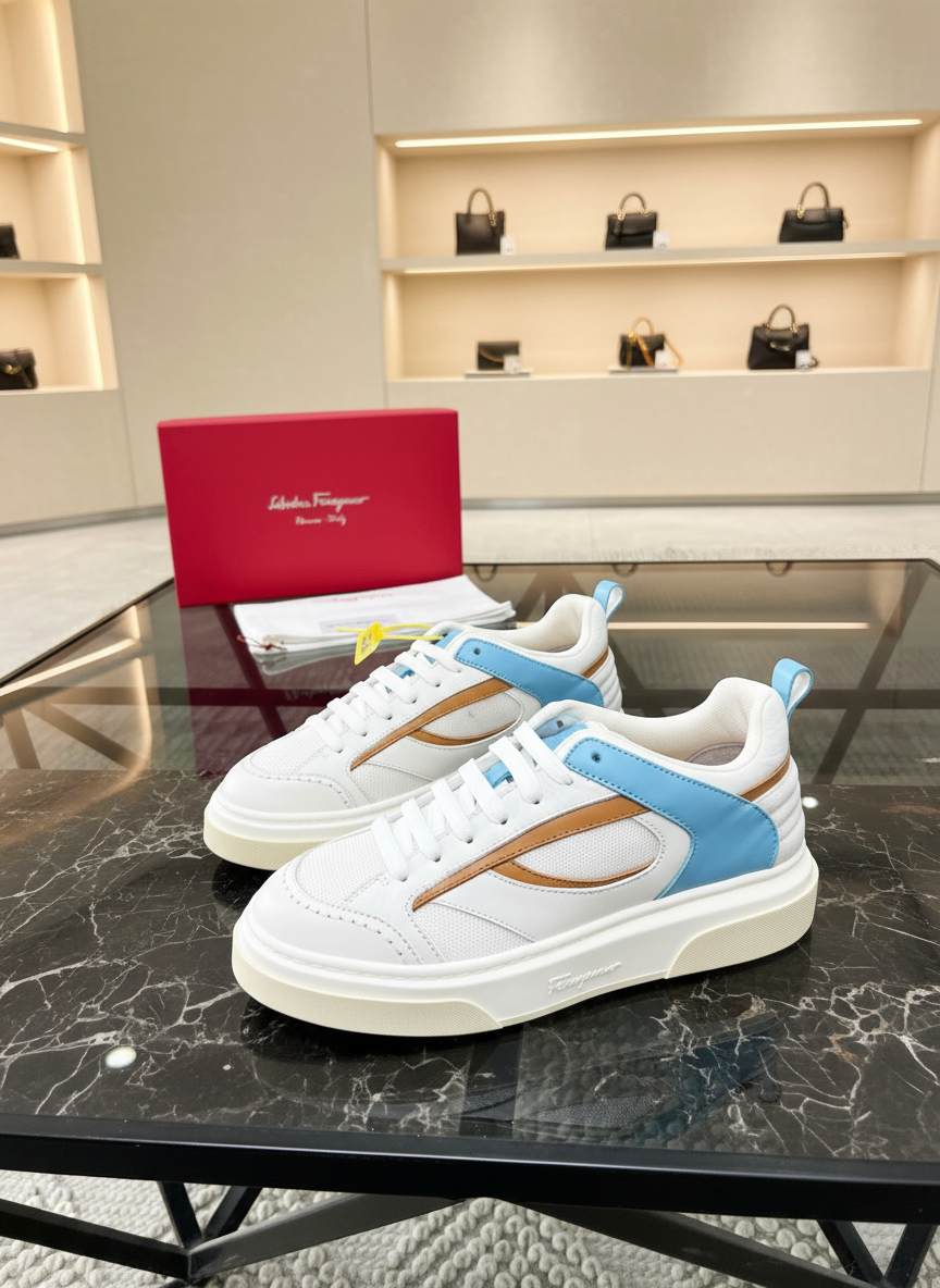 Salvatore Ferragamo men’s white leather sneakers with blue and tan accents, premium Italian craftsmanship, stylish comfort for everyday wear.