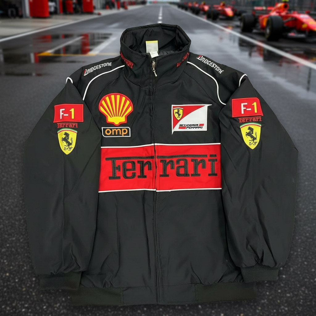 Ferrari F1 Racing Jacket, Black with Red Accents, Scuderia Ferrari Logo, Shell and OMP Patches, Motorsport Team Apparel for Speed Enthusiasts.