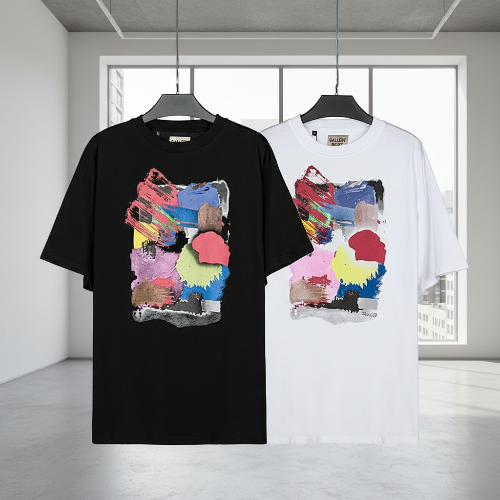 Gallery Dept Paint Splash T-Shirt, bold artistic print, premium cotton, casual streetwear style, available in black or white for a modern expressive look.