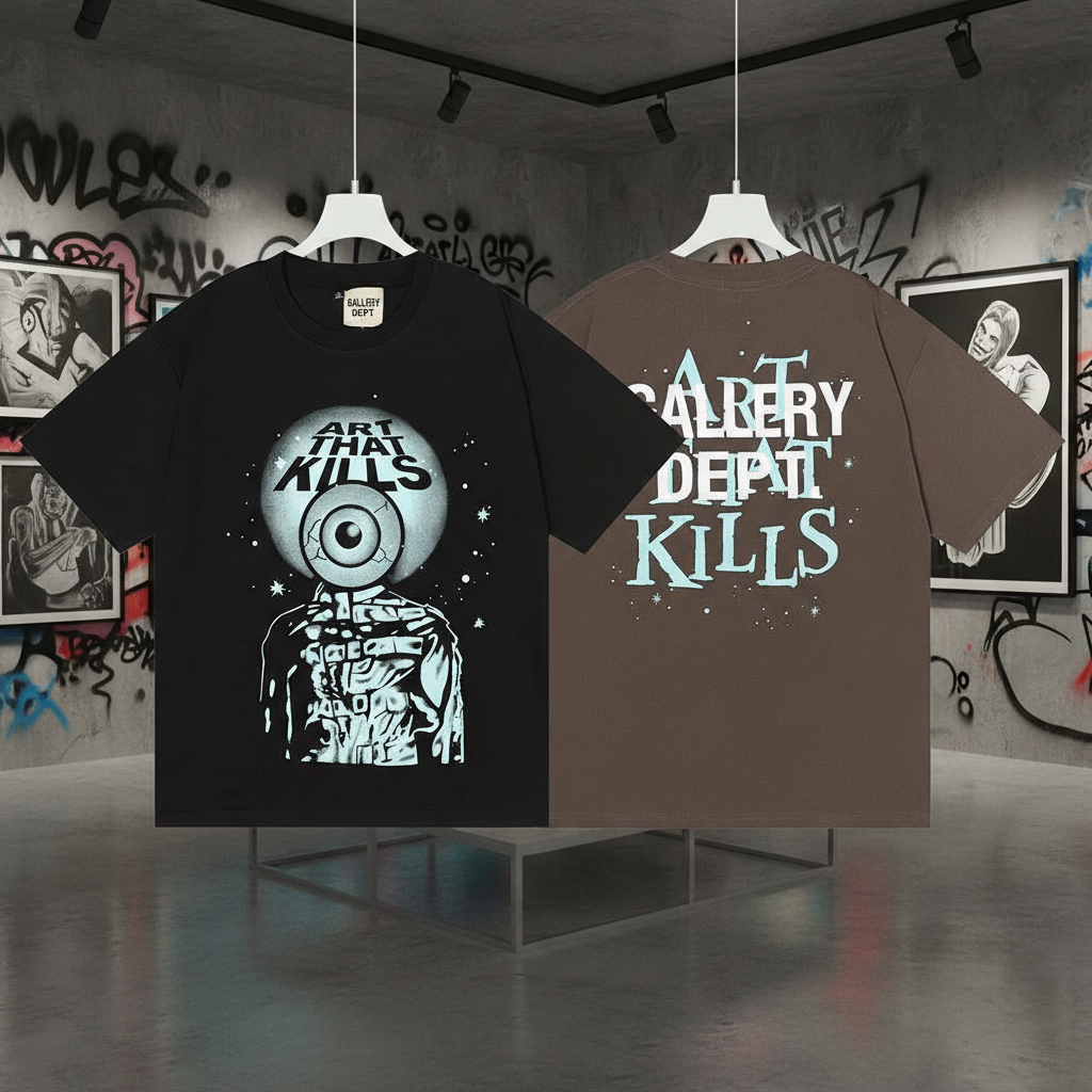 Gallery Dept Graphic T-Shirt featuring bold “Art That Kills” print, premium cotton, casual fit, streetwear style perfect for fashion-forward everyday wear.