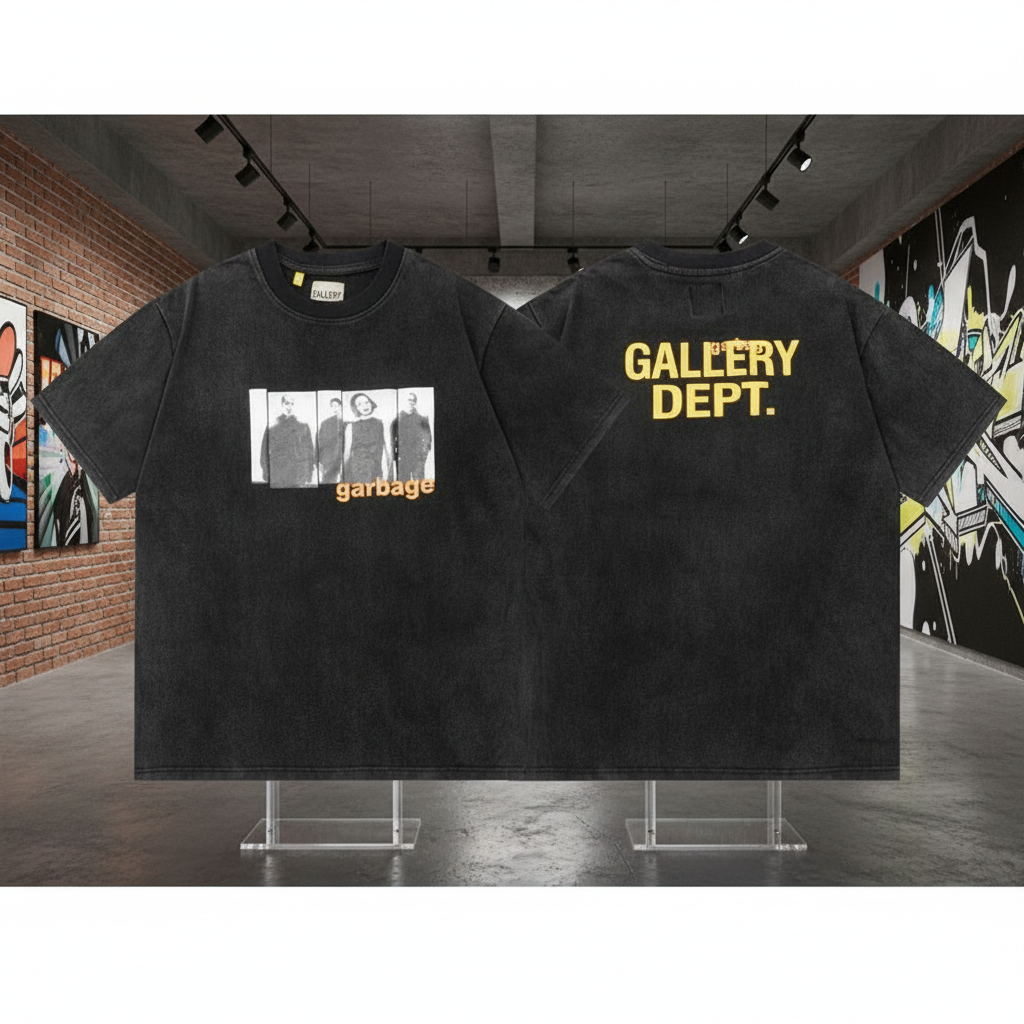 Gallery Dept Vintage Black T-Shirt featuring Garbage band graphic, soft cotton fabric, streetwear style, and bold logo print for a trendy urban look.