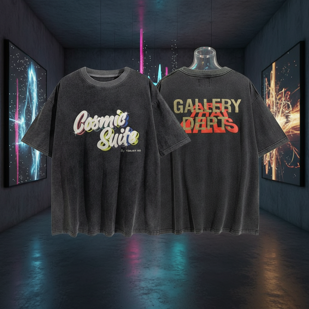 Gallery Dept Cosmic Suite graphic washed black cotton T-shirt, streetwear style, casual loose fit, unisex fashion top for summer.