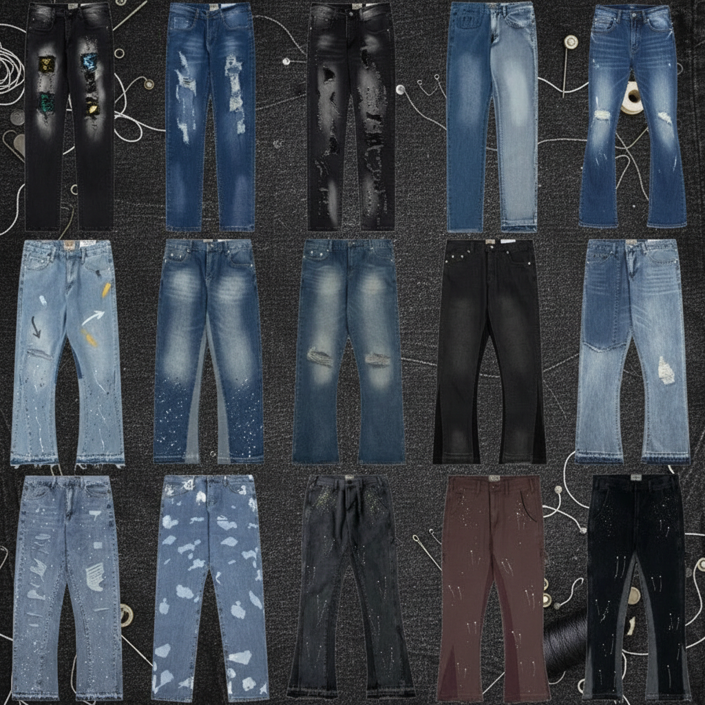 Gallery Dept distressed and painted jeans for men, stylish streetwear denim pants with unique designs, premium quality casual fashion for everyday wear.