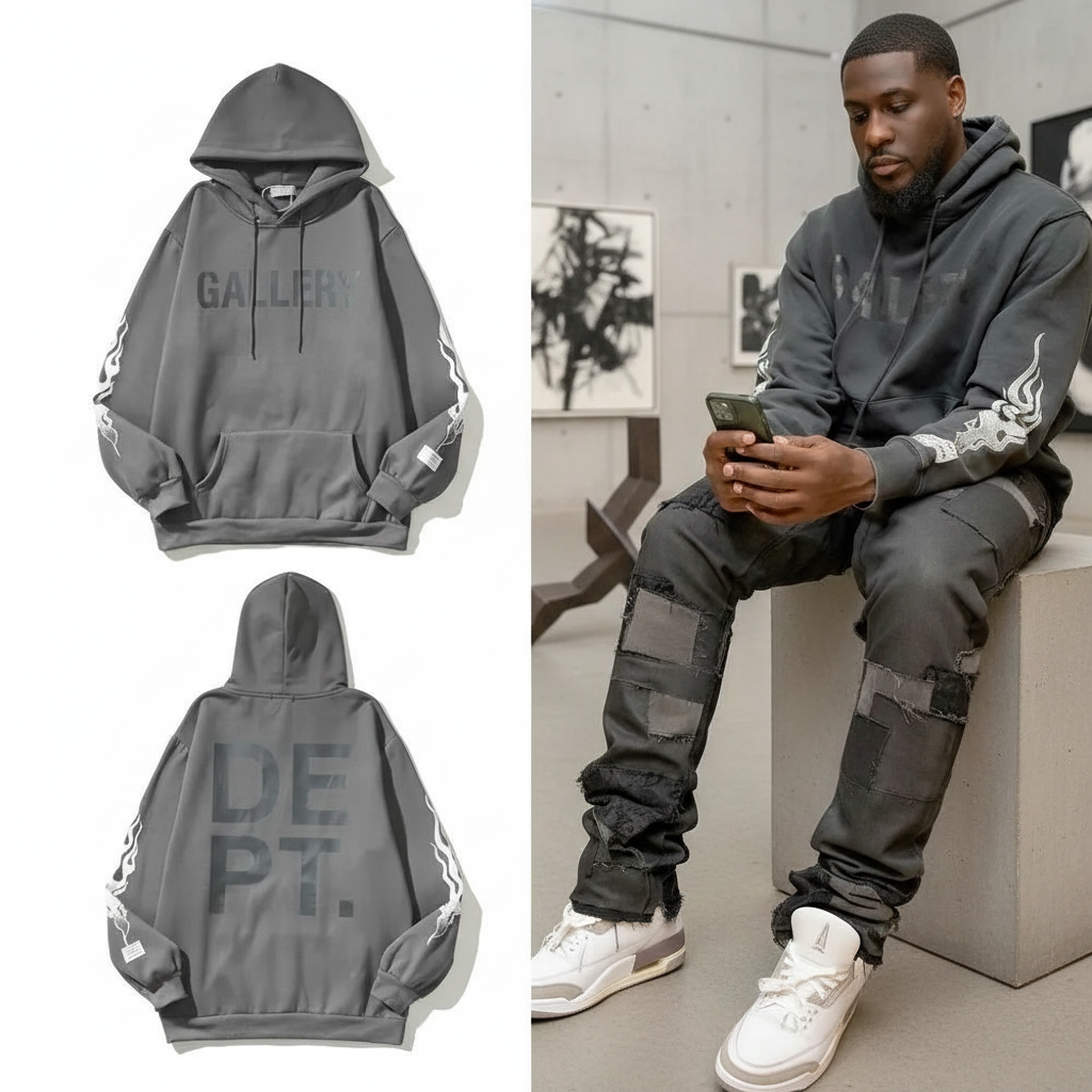 Gallery Dept Hoodie, stylish streetwear with flame sleeve design, soft cotton blend, casual fit, perfect for urban fashion and everyday comfort.